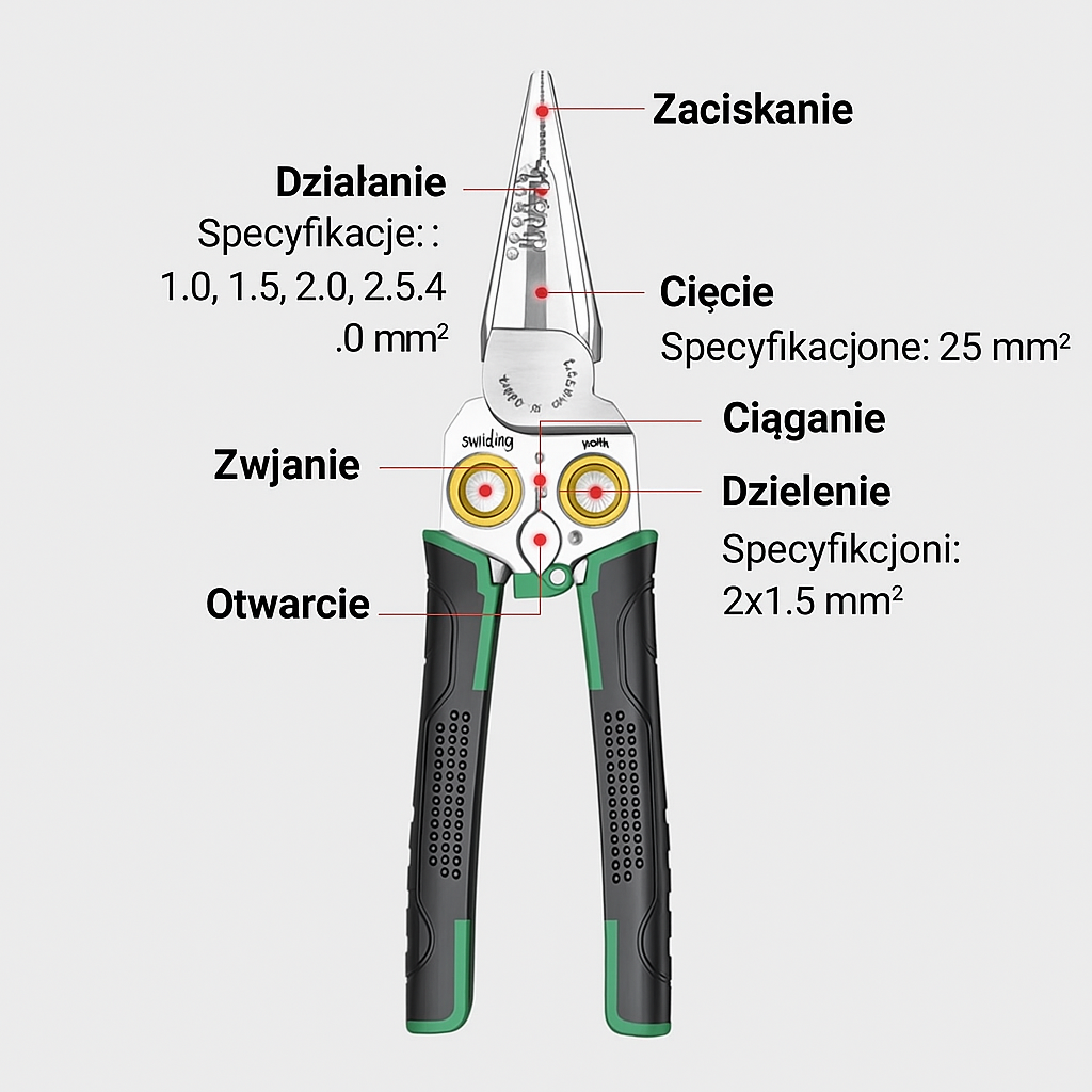 WIELFUNKCYJNE NARZĘDZIE: W tym funkcje do obcinania przewodów, nawijania, otwierania, zaciskania, cięcia i dzielenia. Kompaktowa konstrukcja integruje wiele funkcji dla wygody.